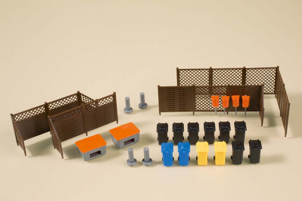 Zum vorbildgerechten Anlagen- bzw. Dioramenbau. - 4 Papierkörben, - 2 Streugutcontainern, - 4 Poller, - 12 Mülltonnen in verschiedenen Farben und - 290 mm Sichtschutzzaun.