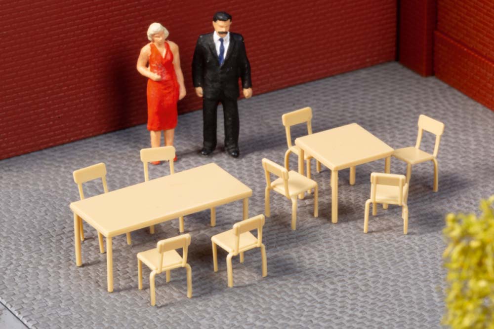 Stühlen und Tischen. An die rechteckigen und quadratischen Tische passen
