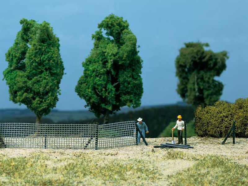 Grau, maschenfest verschweißt. Das gewünschte Format kann mühelos mit der Schere geschnitten und farblich behandelt werden. Es liegen 56 einfache Zaunsäulen und 8 mit Stützen bei.
