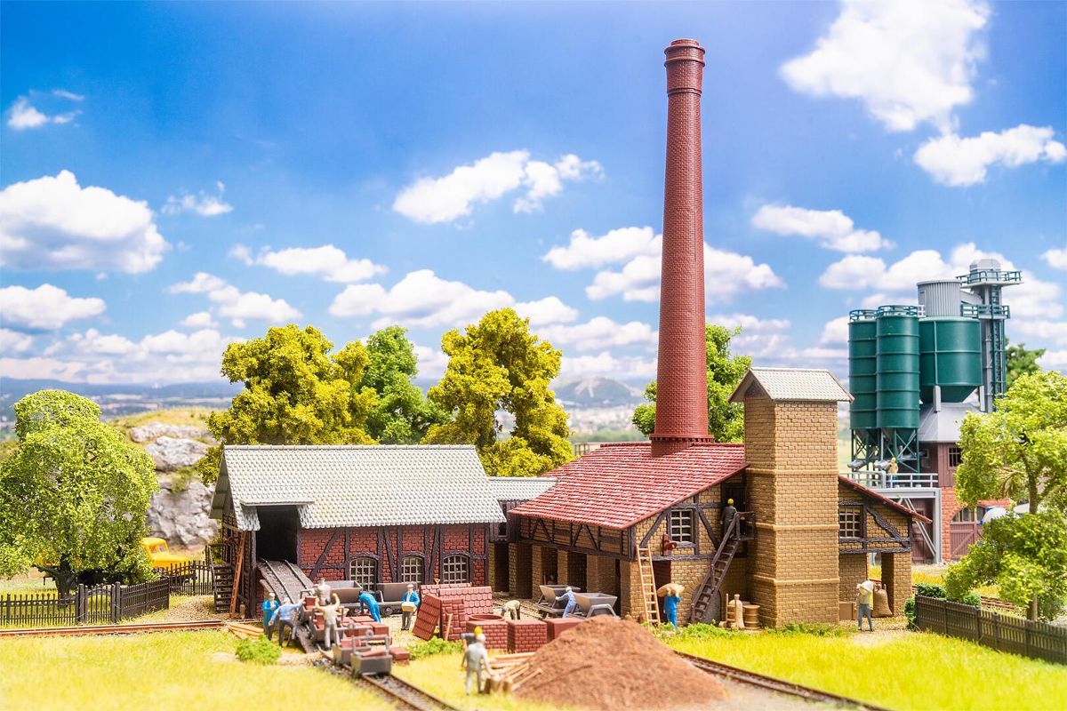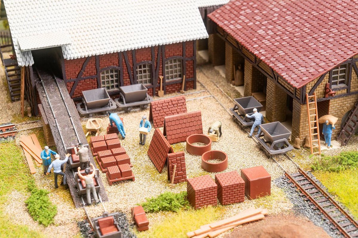 Mehrteiliges Modell, bestehend aus dem Hauptgebäude mit Brennkammern, Brennofen und Schornstein sowie dem Trockenschuppen für die Ziegelrohlinge. Mit Schienenwegen und zahlreichen Ausschmückungsteilen, wie Hand- und Schubkarren, Loren, Leitern, Ziegelstapeln u.v.m.