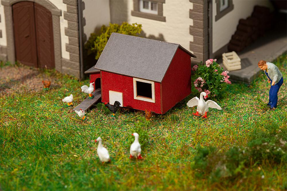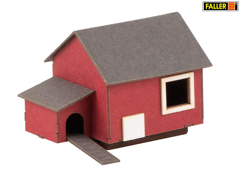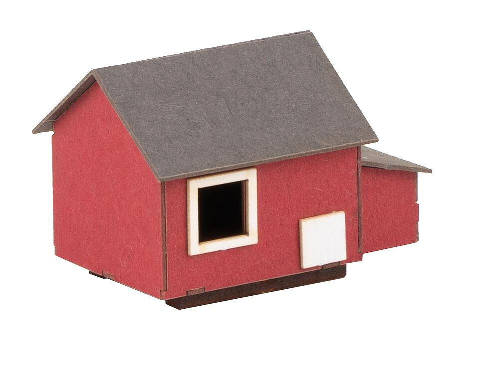 Spur: H0 Epoche: --Lasercut-Modell eines kleinen roten Hühnerstalls mit Satteldach und seitlichem Anbau mit Hühnerleiter.Maße: 34 x 30 x 23 mm