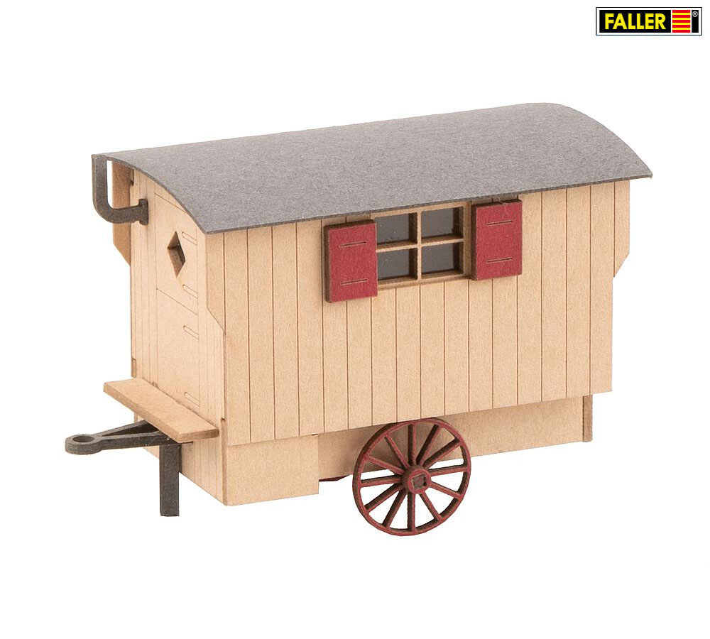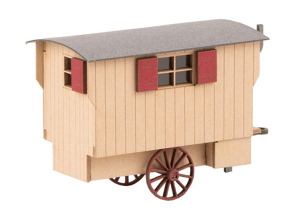Spur: H0 Epoche: --Lasercut-Modell eines Schäferwagens mit roten Fensterläden, zwei Holzwagenrädern und Deichsel.Maße: 49 x 24 x 32 mm