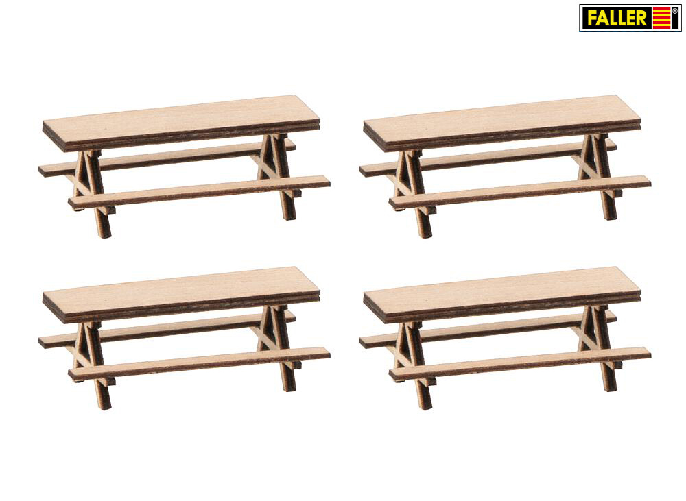 Spur: H0 Epoche: --Lasercut-ModellPausenzeit! Vierer-Set mit im Lasercut-Verfahren hergestellten Picknicktischen mit Bänken.Maße: 26 x 16 x 10 mm (4 x)