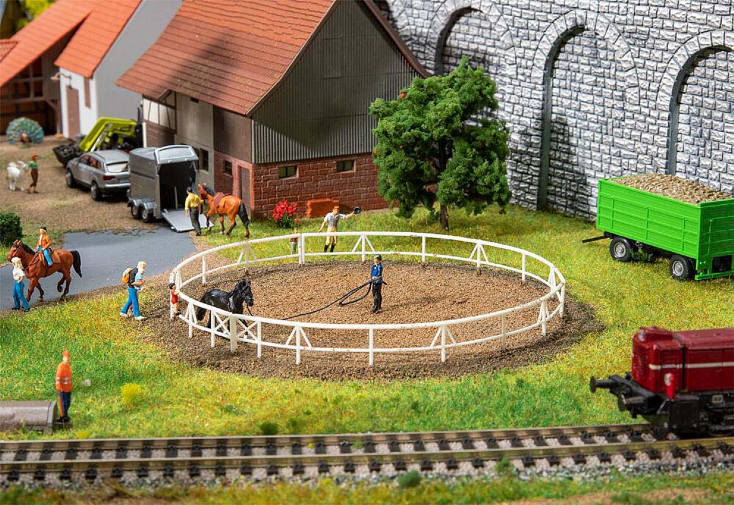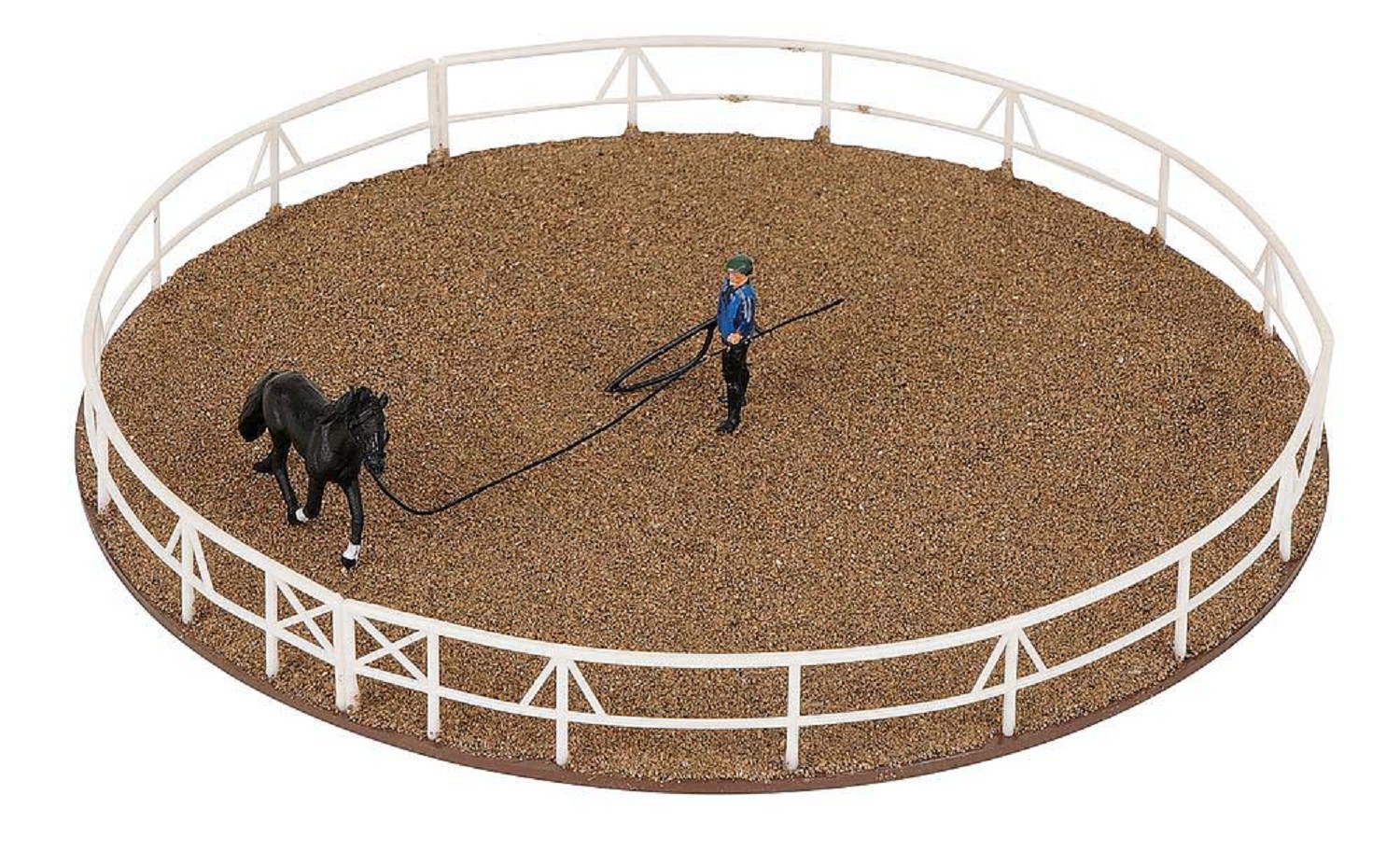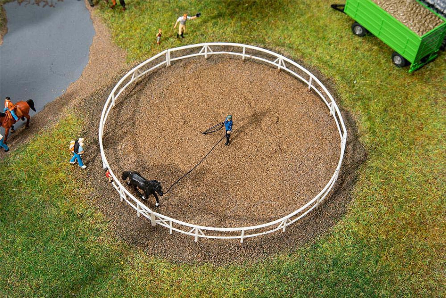 Rund eingezäunter, besandeter Außenreitplatz. Pferd und Reiter bei der Bodenarbeit liegen als Miniaturfiguren für die Szenengestaltung bei. Ø 144 x 20 mm