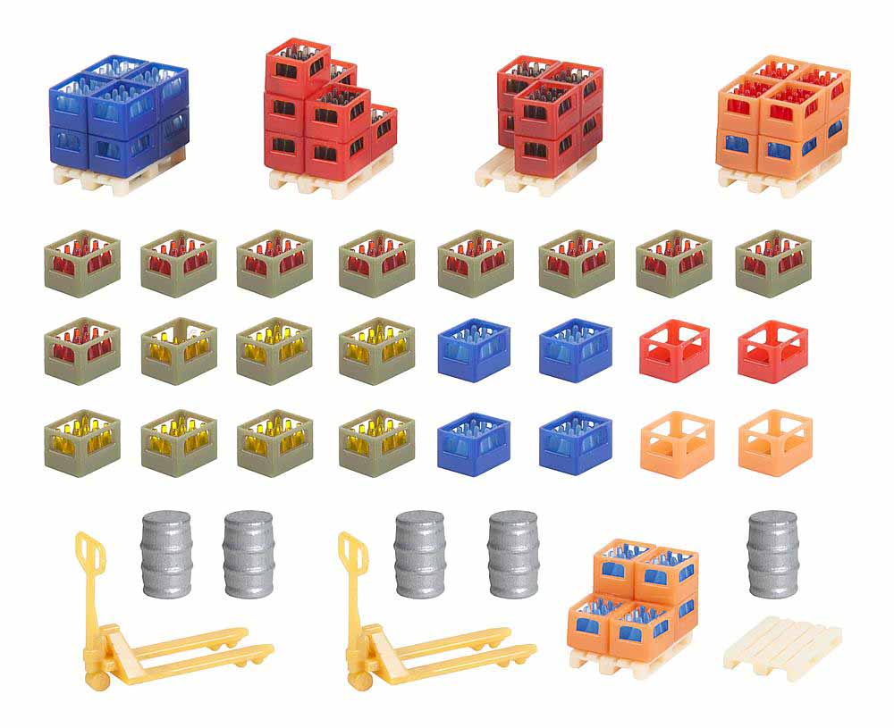 Umfangreiches, mehrfarbiges Ausstattungs-Set mit 60 stapelbaren Getränkekästen, 40 Kasten-Flascheneinsätzen, 160 Einzelflaschen, sechs Paletten, fünf Bierfässern und zwei Palettenhubwagen.