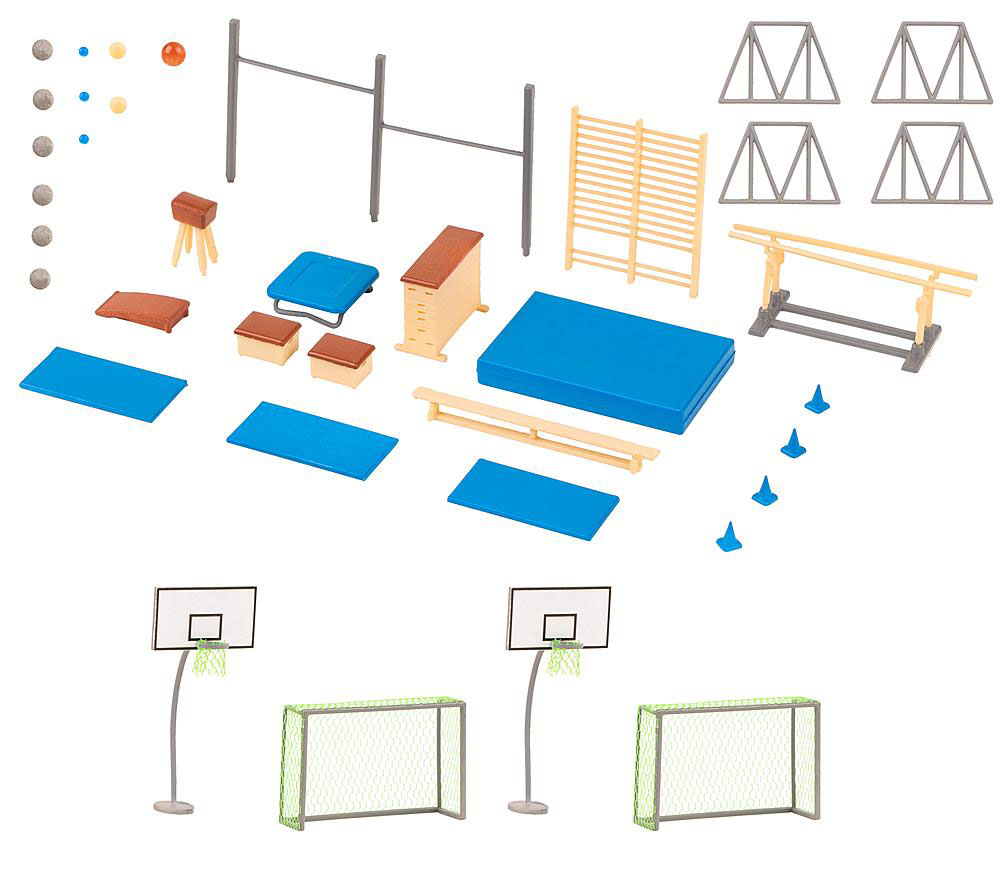 Umfangreiche Turnhalleneinrichtung bestehend aus zwei Handballtoren und Basketballkörben, einem großen und zwei kleinen Kästen, mehreren Weichbodenmatten, Trampolin, Sprungbrett, Reckanlage, Turnbock, Turnbarren und Turnbank sowie verschiedenen Bällen. Auch als passendes Zubehör für das PREMIUM Modell 2019 »Turnhalle«, Art. 130613 geeignet.