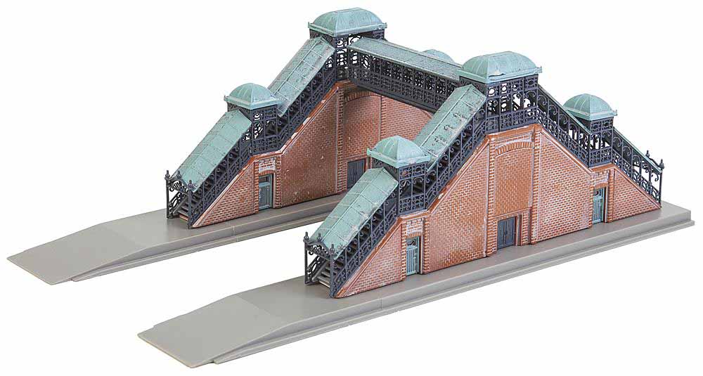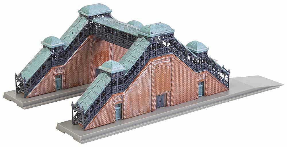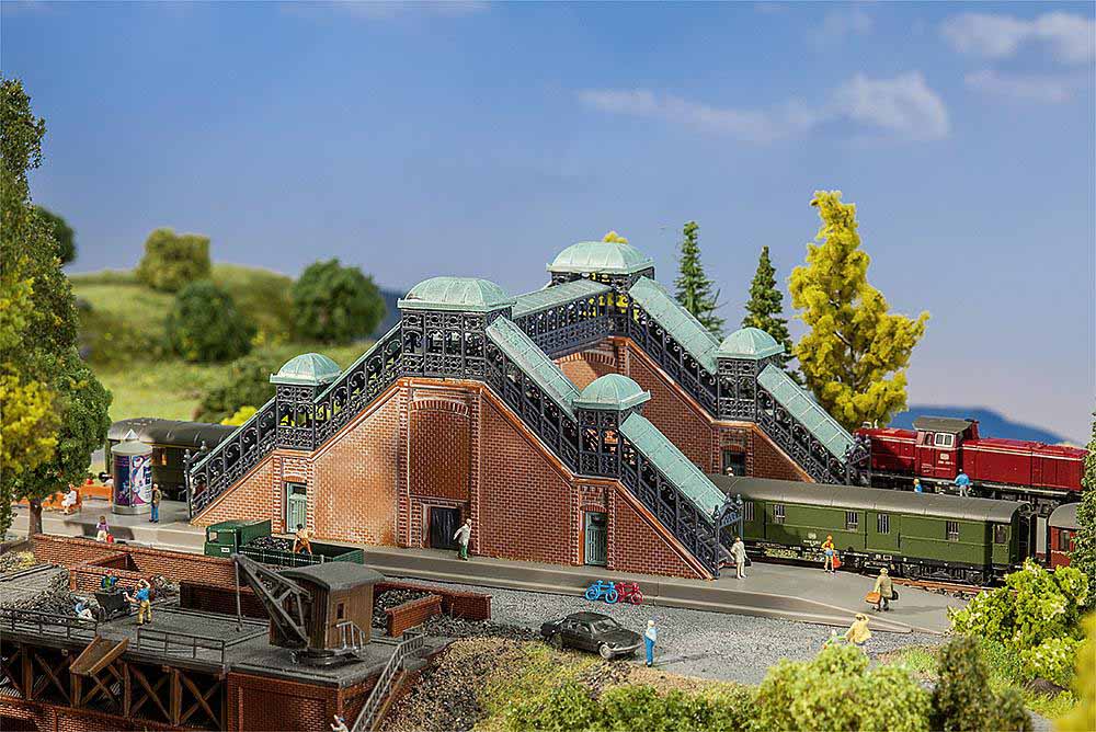 Massive Fußgängerbrücke mit seitlichem Mauerwerk. Treppenaufgänge und Überweg sind überdacht und mit aufwendigen Stahlverzierungen gestaltet.