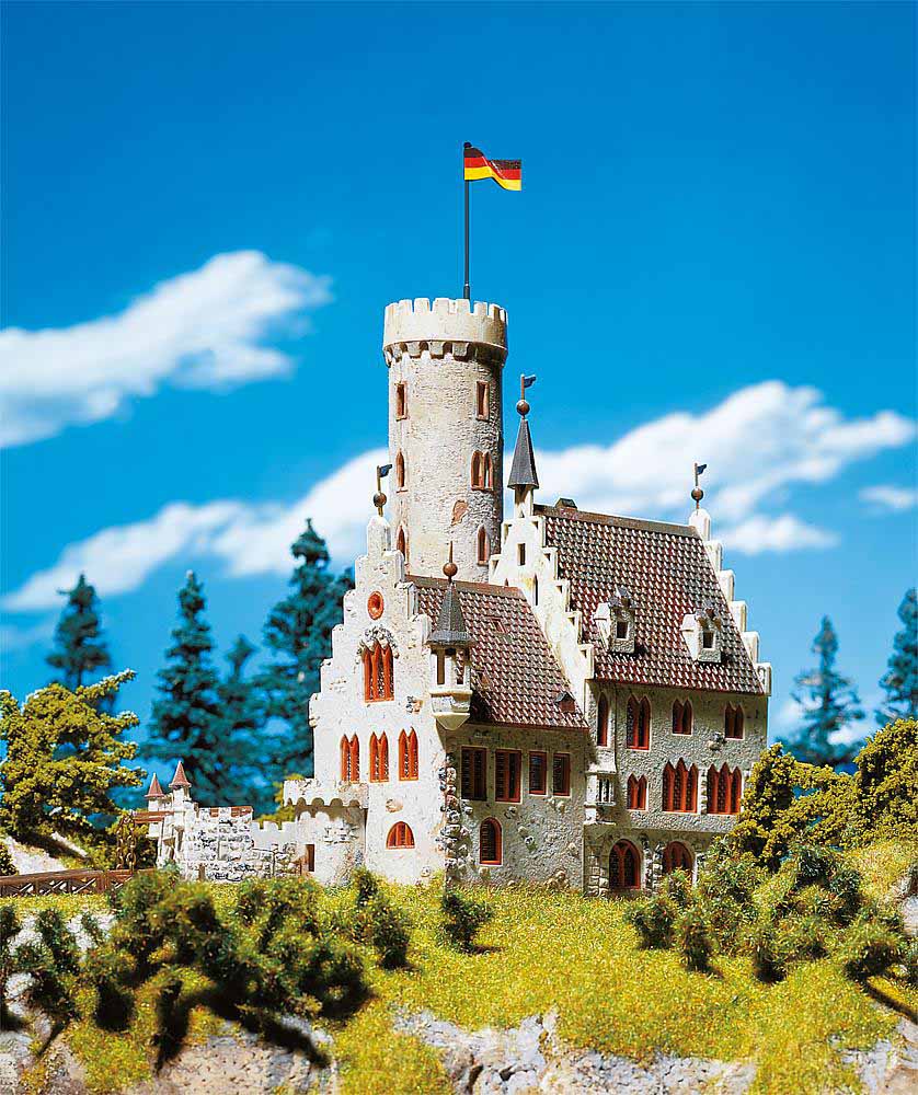 Das Bodenteil dieser romantischen Burg ist zu einem Wassergraben ausgearbeitet, der den ganzen Komplex umläuft; der Graben kann mit Wasser gefüllt werden. Die Bodenfläche des Wassergrabens ist 255 x 130 mm.