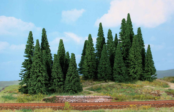 Sehr fein beflockte Tannen in zwei verschiedenen Farben in der Beutelpackung. Geeignet für die Spurweiten H0, TT und N.