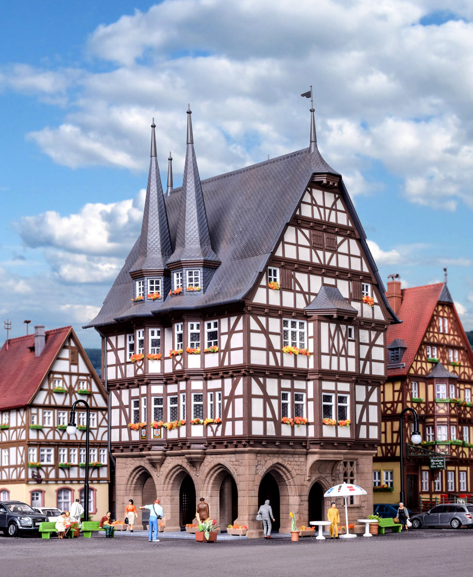 Bausatz. Mit dem Rathaus Alsfeld rundet kibri die Serie der Fachwerkhäuser ab. Der Bau des Rathauses in Alsfeld wurde im Jahr 1512 begonnen. 1883 wurden die zugemauerten Arkaden freigelegt, 1887/88 die Türme auf der Vorderseite aufgesetzt, 1910/11 eine Generalrenovierung durchgeführt und 1967/68 auch die Türme auf der Rückseite wieder angebracht. Nach seiner vollständigen Restaurierung ist das Rathaus ein hervorragendes Beispiel denkmalpflegerischer Tätigkeit in Alsfeld, Maßstab für die Liebe der Bürger zu ihrer Stadt und für die Einstellung der Gremien in Frage der Altstadterhaltung. Es ist das unverwechselbare Wahrzeichen Alsfelds. Der Gesamtaufbau stellt eine sehr gelungene Verbindung von Steinarchitektur und Holzbau dar. Mit Stecksystem. Hergestellt im Zweifarben-Spritzgießverfahren. Maße: L 16 x B 16 x H 27 cm. Schwierigkeitsgrad: 2 (Fortgeschrittene).