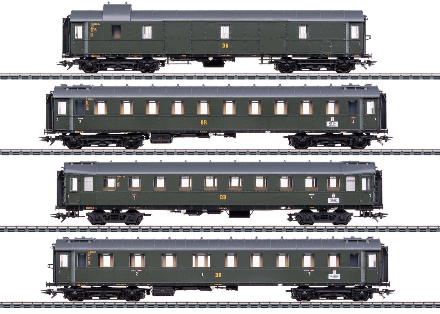 Vorbild: 4 Schnellzugwagen der Einheitsbauart 1928-30 und 1923 Hecht der Deutschen Reichsbahn der DDR (DR/DDR). 1 Schnellzug-Gepäckwagen Pw4ü-29. 1 Schnellzugwagen C4ü-28, 3. Klasse, Ordnungsnummer 1. 1 Schnellzugwagen C4ü-23 Hecht, 3. Klasse, Ordnungsnummer 2. 1 Schnellzugwagen ABC4ü-29, 1./2./3. Klasse, Ordnungsnummer 4. Zuglauf für den Schnellzug D 11: Dresden-Warnemünde, mit Kurswagen Praha-Kobenhavn (Wagen mit Ordnungsnummer 4). Alle Wagen in flaschengrüner Grundfarbgebung. Betriebszustand Epoche IIIa, Anfang der 1950er Jahre.
