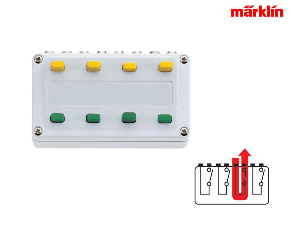 Zum Ein- oder Ausschalten von 4 verschiedenen Bahn- oder Lichtstromkreisen. Beispielsweise können 4 Abstellgleise in verschiedenen Fahrstromkreisen geschaltet werden. Mit 8 rückseitigen Anschlussbuchsen. Alle Anschlüsse für neue Stecker aus dem Set 71400. 8 passende Stecker liegen bei. Abmessungen 80 x 40 mm.