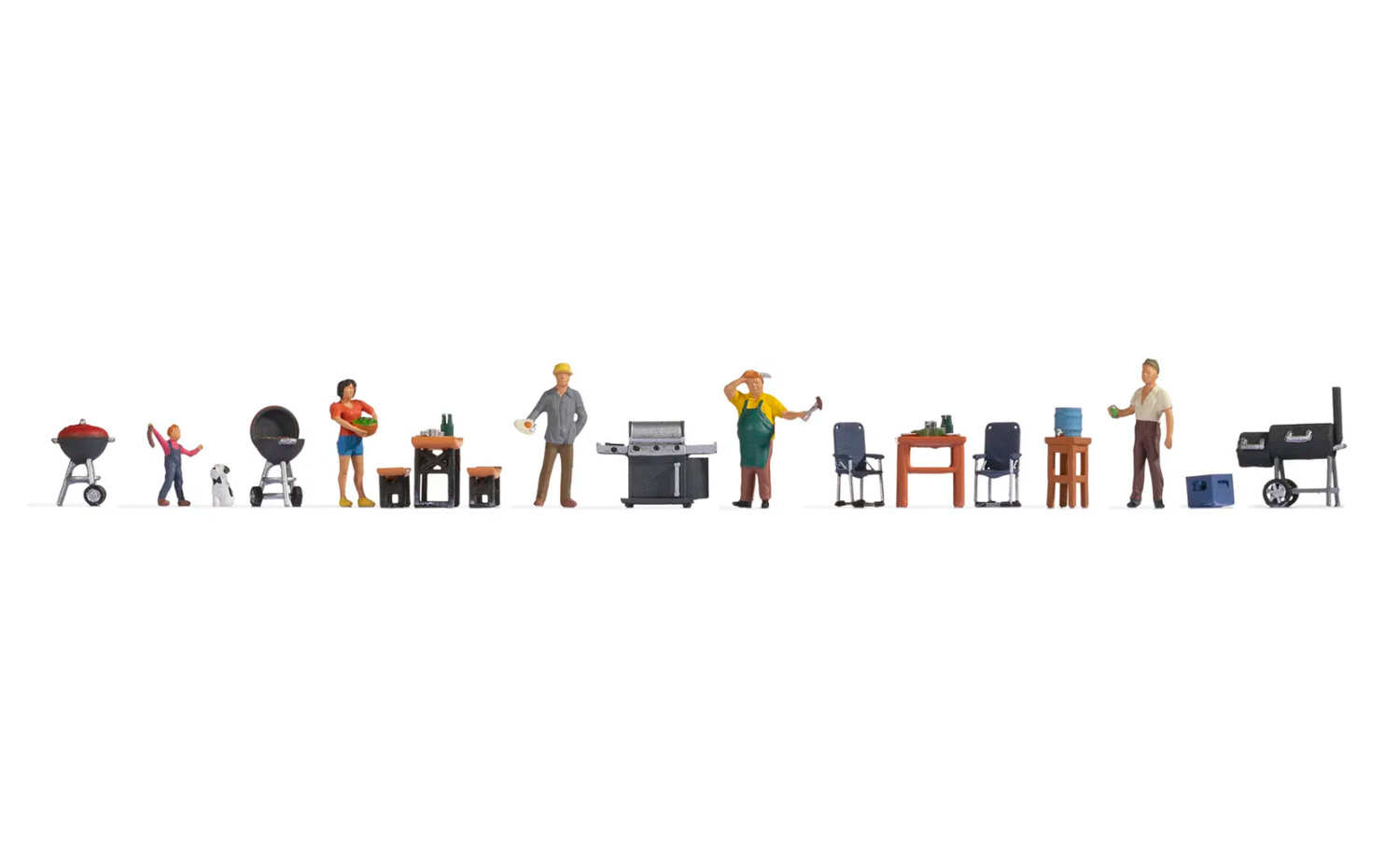 Die NOCH Themenwelt hat neue Figurenthemen-Welten, die sich ideal eignen, um eine sommerliche Landschaft noch wirklichkeitsnäher zu gestalten. Die Figuren-Themenwelt »Grill-Party« bringt alles mit sich, um einen schönen Grillabend mit Freunden so richtig gemütlich zu machen. 2 große Kugelgrills stehen bereit, um das saftige Fleisch und das frische Gemüse knusprig zu braten. Die Biertische, Campingtische mit den Bierbänken und Campingstühlen stehen bereit und lassen alle Gäste gemütlich zusammen sitzen. Die Bierflaschen sind gekühlt und einem tollen Sommerabend mit Essen, Trinken und den Freunden steht nichts mehr im Wege. Dieses tolle Erlebnis darf auf keiner Modelllandschaft fehlen - hier ist gute Stimmung garantiert!