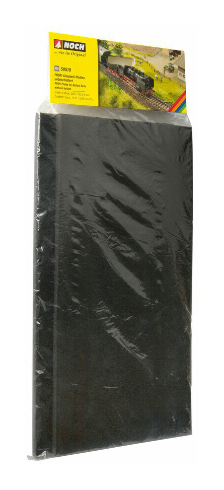 NOCH PROFI Schotter-Gleisbett genügt den höchsten Ansprüchen von Profi-Modellbahnern an Qualität und Aussehen. Gleichzeitig ist es die wohl einfachste Möglichkeit überhaupt, ein Gleisbett super-realistisch zu gestalten. Die Schwellen des Gleises werden einfach in die Schaumstoff-Gleisbettung eingedrückt. Eine Verklebung mit dem NOCH Latex-Kleber ist ebenso möglich wie eine „schwimmende Verlegung“, bei der die Gleise durch das Gleisbett direkt mit der Grundplatte bzw. Gleistrasse verschraubt werden.