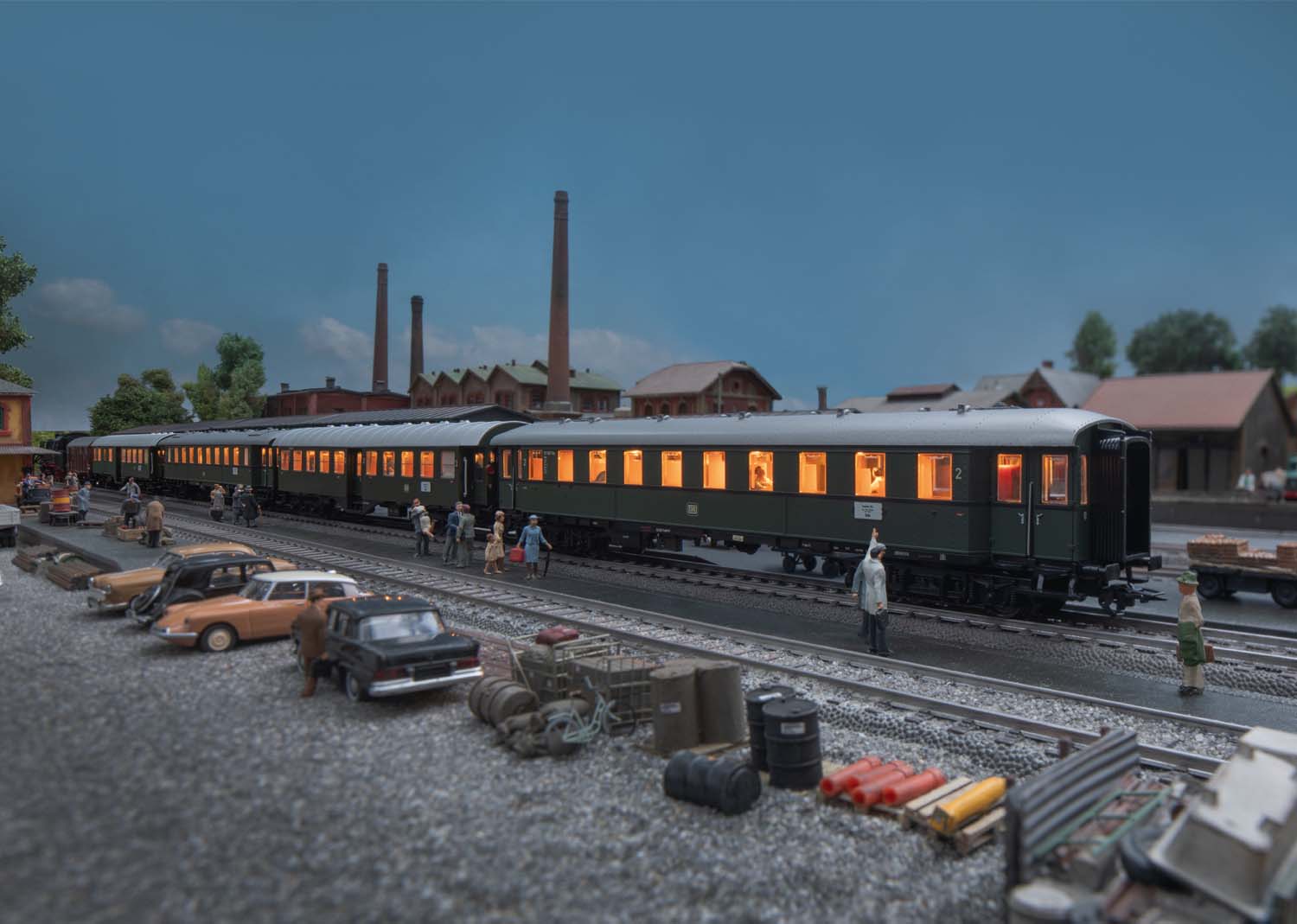 Vorbild: Ein Güterwagen und vier Reisezugwagen unterschiedlicher Bauart der Deutschen Bundesbahn (DB). Ein gedeckter Güterwagen Gmms 44, ein vierachsiger Umbauwagen 2. Klasse mit Gepäckraum BD4yge, zwei vierachsiger Reisezugwagen 2. Klasse B4ye der Einheitsbauart und ein vierachsiger Umbauwagen 2. Klasse B4yge. Zuglauf: Frankfurt [M] – Gießen – Marburg – Biedenkopf – Siegen – Troisdorf – Köln. Reisezugwagen in flaschengrüner Grundfarbgebung. Gmms 44 in Rotbraun.