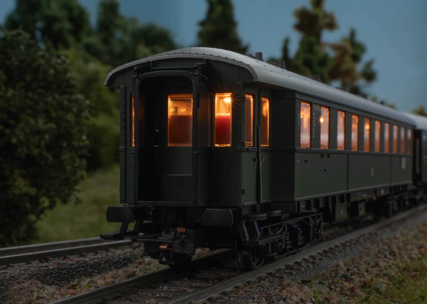 Modell: Jeder Reisezugwagen Wagen mit serienmäßig eingebauter LED Innenbeleuchtung und Pufferspeicher. Sitzwagen mit insgesamt 20 Miniatur-Figuren der Fa. Preiser bestückt. Gesamtlänge über Puffer ca. 103 cm.