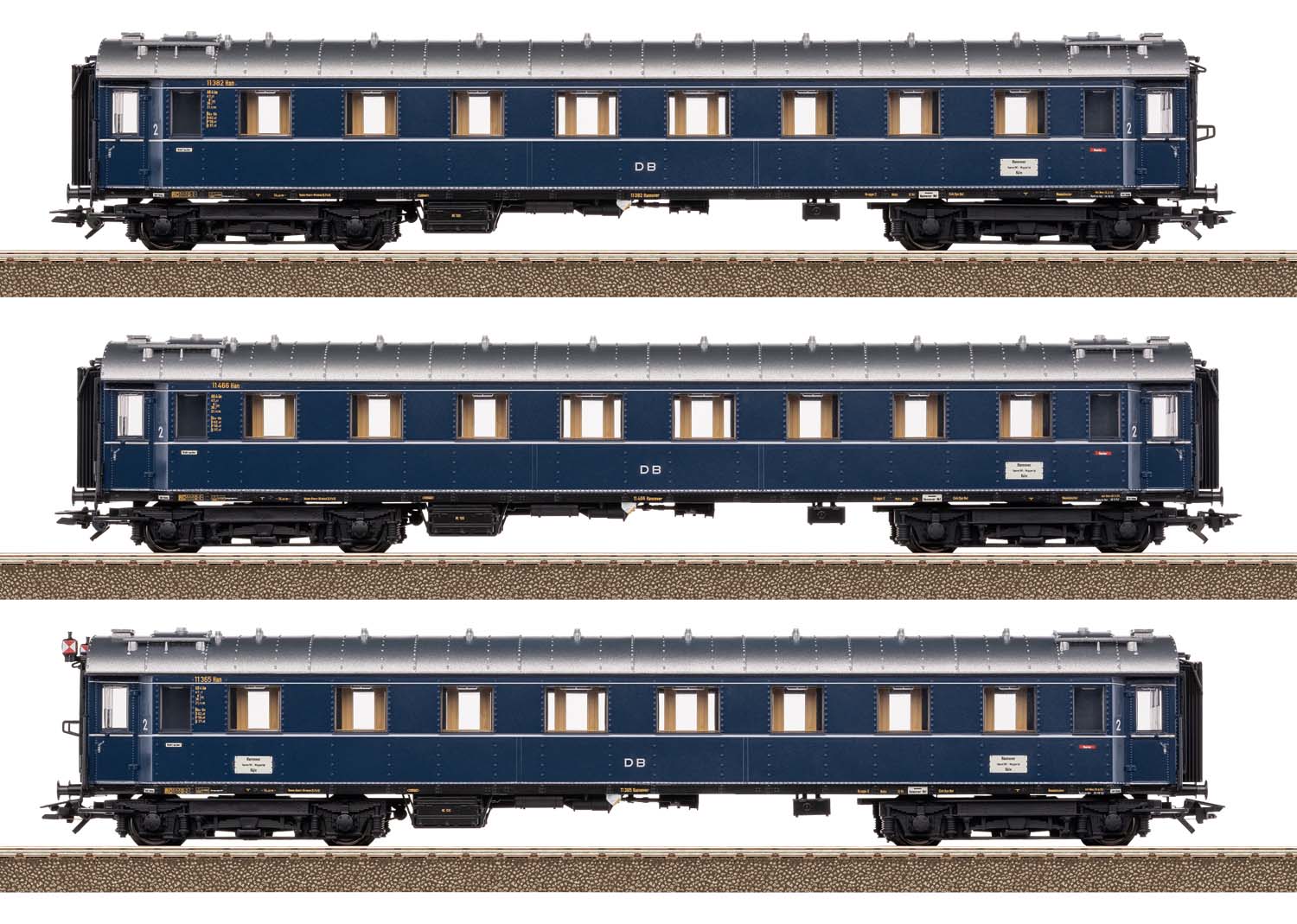 Modell: Detaillierte Ausführung in vollem Längenmaßstab. Alle Wagen mit serienmäßig eingebauter LED-Innenbeleuchtung mit warmweißen Leuchtdioden (LED) und Pufferkondensator. Ein Wagen serienmäßig an einem Ende mit Zugschlussbeleuchtung ausgestattet. Reisezugwagen mit mehrfarbiger Inneneinrichtung. Drehgestelle der Bauart Görlitz II schwer. Stirnseitig separat angesetzte Aufstiegsleitern und angesetzte Griffstangen. Befahrbarer Mindestradius 360 mm. Gesamtlänge über Puffer ca. 75,5 cm.