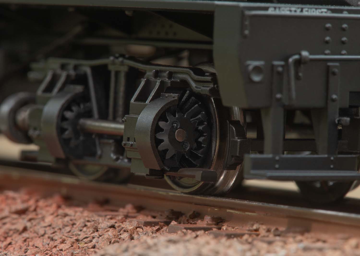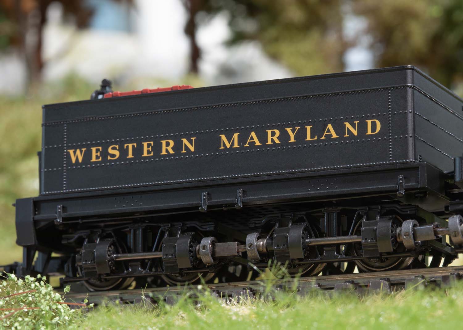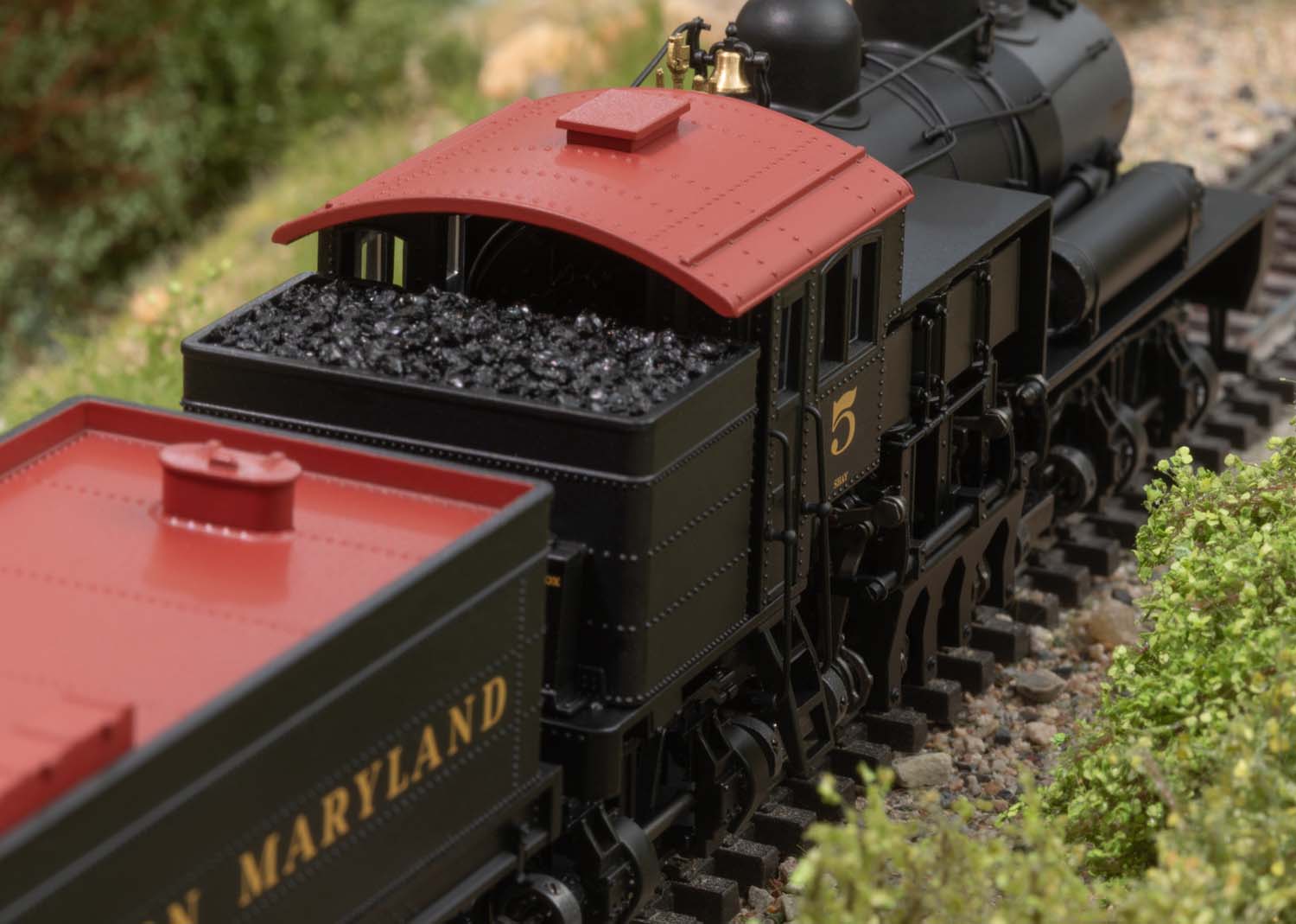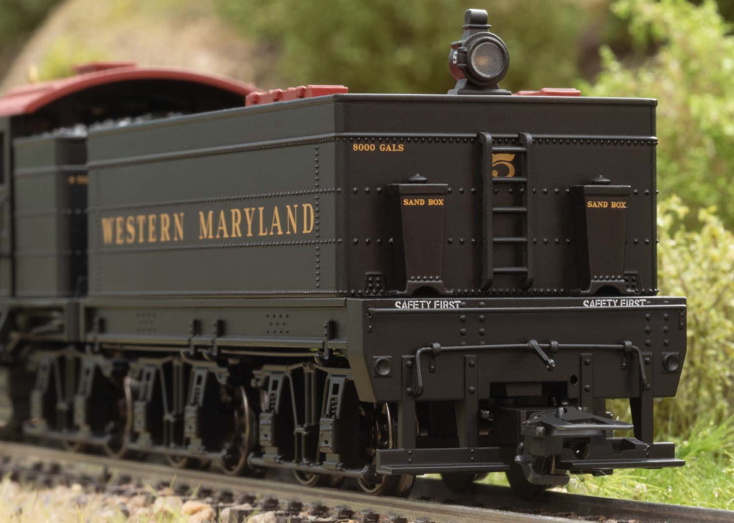 Vorbild: US-Getriebe-Dampflokomotive Bauart Shay, Class D. Ausführung mit 4 Treibdrehgestellen. Antrieb über Kurbelwellen auf Gelenkwellen und über Kegelzahnräder auf die Drehgestelle. Mit charakteristisch nach links versetztem Kessel. Überwiegend im Einsatz bei amerikanischen Feld- und Waldbahnen, auf Strecken mit engen Kurven und starken Steigungen. Western Maryland Lok-Nummer 5. Betriebszustand der 1940er Jahre.