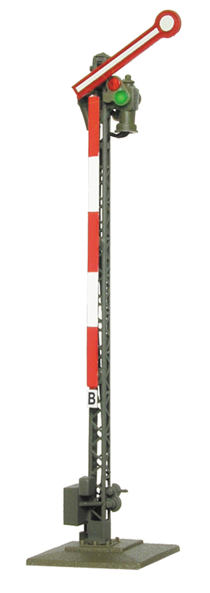 Mit filigranem Gittermast aus Messing in originalgetreuer Lackierung, bedrucktem Signalflügel und Unterflur-Kompaktantrieb mit integrierter Zugbeeinflussung. Wartungsfrei dank LED-Beleuchtung. Signalbilder Hp0 und Hp1.