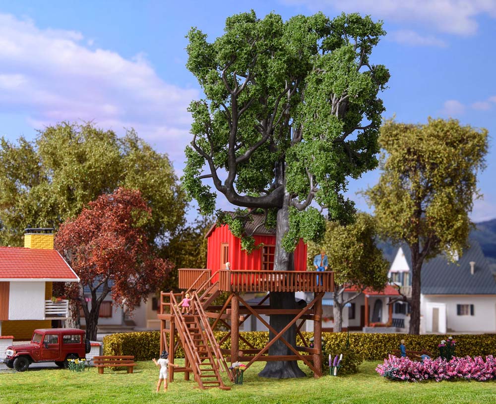 Welcher Junge träumt nicht von einem Baumhaus? Dieses Baumhaus besteht aus dem Haus mit Holztreppenaufgang, einem Baum, Belaubungsmaterial und Sitzbänken. Wieder jung? Na sehen Sie, so einfach geht das!