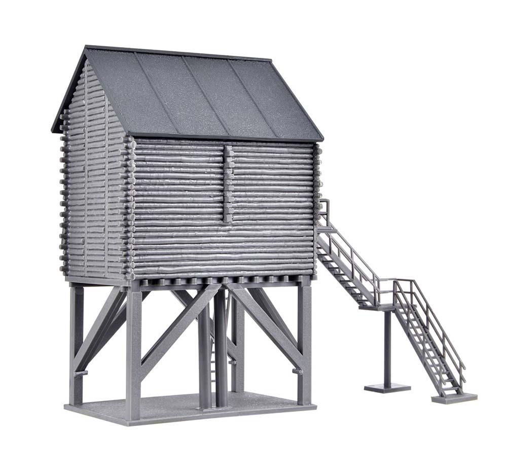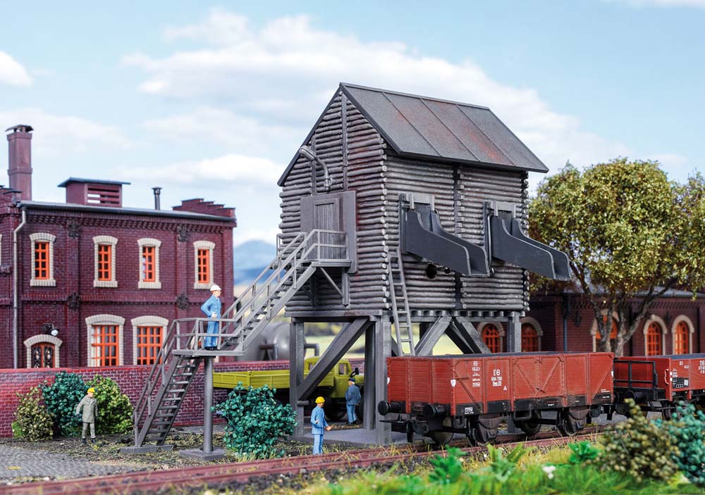 Funktionsbausatz. Diese Verladestation ist der kleine Bruder des Kieswerks Art. 45723. Sie eignet sich aufgrund des geringen Platzbedarfs hervorragend, um Leben auch auf kleine Anlagen zu bringen. Über eine Öffnung im Dach wird das Gebäude mit Schotter befüllt. Durch elektromagnetische Betätigung der Verschlussklappen gelangt der Kies über Laderutschen in die zum Abtransport bereitstehenden Güterwagen. Die Aufsichtspersonen können über eine Außentreppe in das Gebäude gelangen.