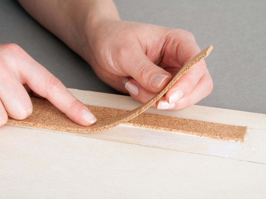 Für die »freie« Strecke eignen sich die Kork-Gleisbettungen mit einer Länge von je 50 cm. Diese sind in der Mitte mit einem Gehrungsschnitt versehen, sodass man sie einfach an den Kanten nach außen auseinanderknicken kann, um die Bettung in zwei Streifen zu trennen. Anschließend werden die Streifen mit den Böschungswinkeln nach außen gegeneinander auf dem Anlagenunterbau verklebt.