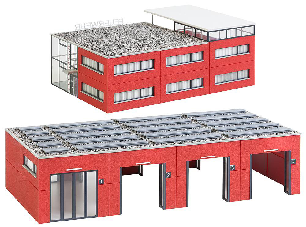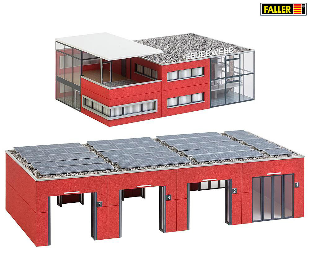 Transparente Fahrzeughalle: am zweiten Flachdachbau, wo täglich die schweren Feuerwehrfahrzeuge ein- und ausrücken, fällt durch verglaste Falttore großzügig Tageslicht in die Hallen. Toröffnungen zur Vorder- und Rückseite ermöglichen den Einsatz von FALLER Car System.
