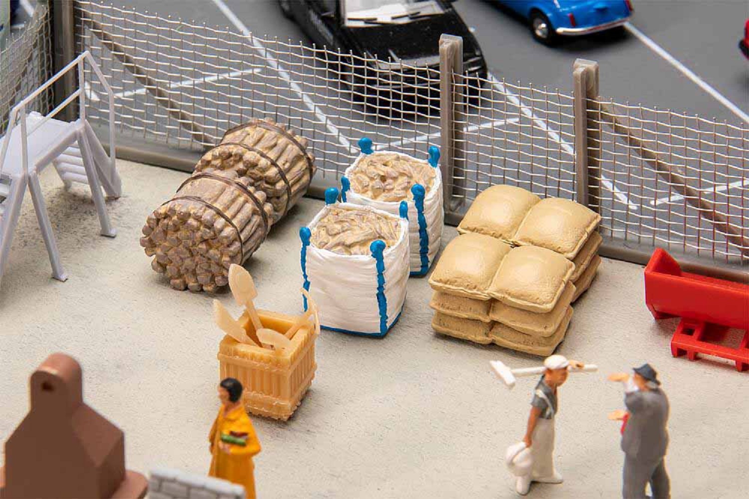 Logistikausgestaltung. Modernes Ladegut-Set mit gefüllten Big-Bags, Holzbünden und gestapelten Säcken.