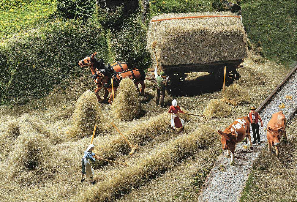 Diese Packung enthält alles, was bei der Heuernte anfällt: mehrere Heuhaufen, zusammengerechte Heureihen, beladener Heuwagen, Sensen und Zubehörteile. Heufasern und Klebstoff liegen bei.