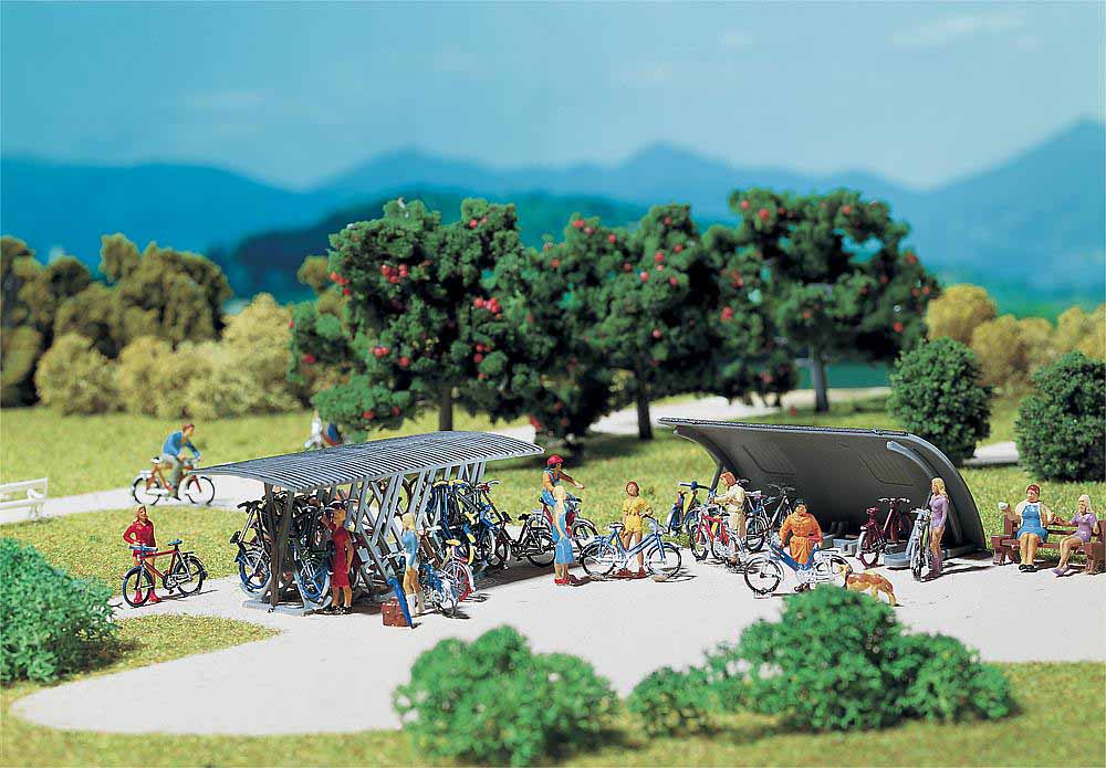 Die beiden Radständer mit den 16 Fahrrädern (8 Damen- und 8 Herrenräder) sind Ausschmückungsdetails, die wohl auf jeder Anlage an vielen Plätzen für noch mehr Realität in der Modellwelt sorgen – gesund und umweltfreundlich.
