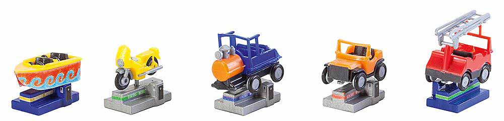 Spannende Verfolgungsjagden auf dem Motorrad, Großeinsätze der Feuerwehr oder mit dem Speedboat die Wellen pflügen. Münzen rein und los geht das Abenteuer in einem der fünf Schaukelautomaten. Zum Bausatzumfang gehören auch ein Geländewagen und selbstverständlich eine Lok.
