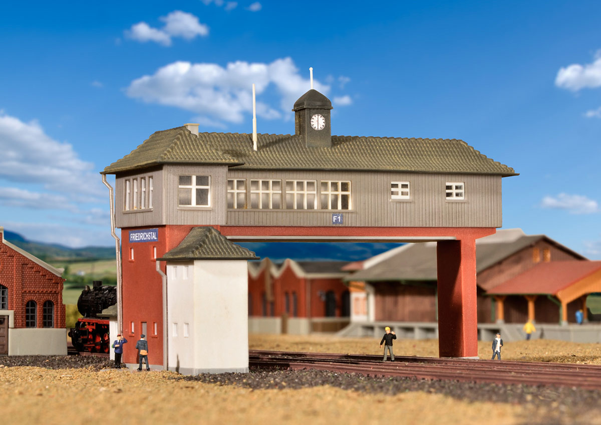 Spur: Z Epoche: --"Brückenstellwerk Friedrichstal"Bausatz. Überspannt 3 Gleise. Durchfahrtshöhe: 3,2 cm. Durchfahrtsbreite: 6,8 cm. Maße: L 11 x B 6,5 x H 7,3 cm. Schwierigkeitsgrad: 2 (Fortgeschrittene).
