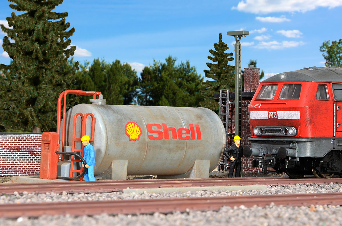 Spur: H0"Dieseltankstelle" - Bausatz. Maße: L 11,5 x B 10 x H 4 cm. Schwierigkeitsgrad: 1 (Einsteiger).