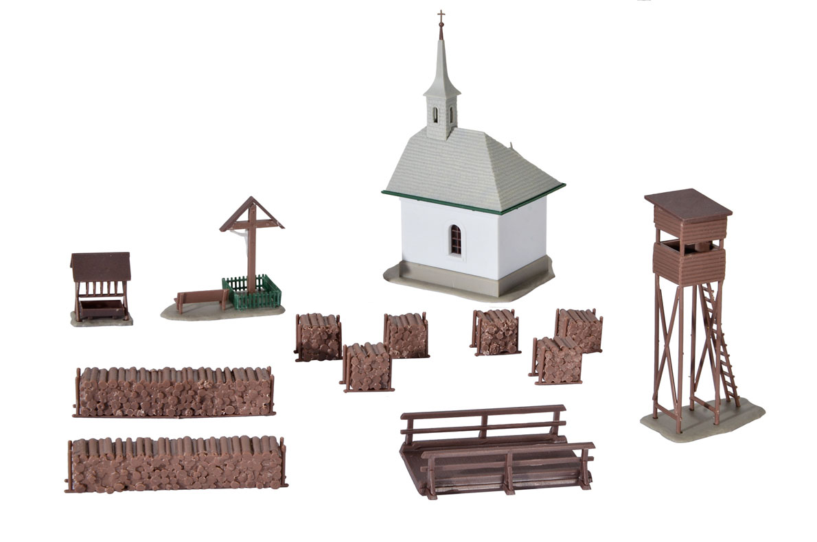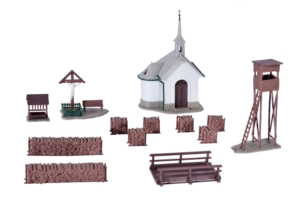 Spur: H0 Epoche: --"Kapelle in Hirschbichl mit Zubehör"Bausatz. Maße: L 6 x B 6 x H 10 cm. Schwierigkeitsgrad: 2 (Fortgeschrittene).