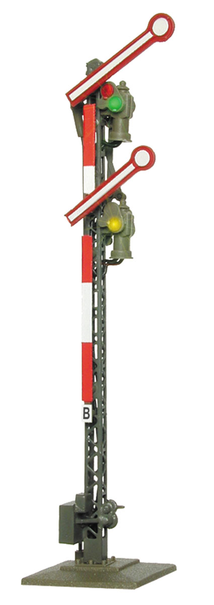 Mit filigranem Gittermast aus Messing in originalgetreuer Lackierung, 2 bedruckten Signalflügeln und Unterflur-Kompaktantrieb mit integrierter Zugbeeinflussung. Wartungsfrei dank LED-Beleuchtung. Signalbilder Hp0 und Hp2. Höhe: 66 mm.
