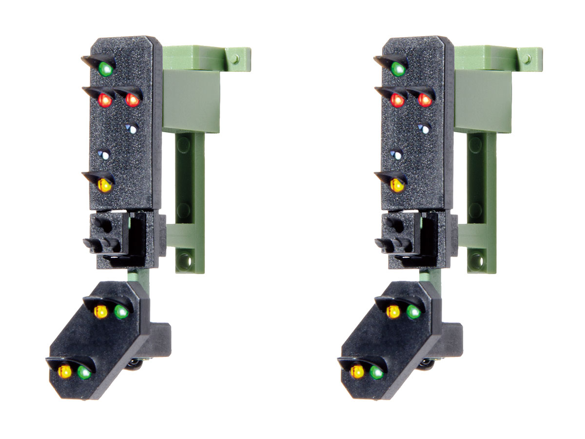 Signalköpfe nach Bauart 69 ohne Mast, aber komplett verkabelt. Zur Montage an Gebäuden (z. B. kibri Brückenstellwerk Hamm Art. 39310) oder an den Signalbrücken Art. 4750 und 4755. Die Signalköpfe werden am Ausleger der Signalbrücke eingeklipst und lassen sich daher leicht austauschen. Anschluss an die Steuermodule Viessmann Multiplexer Art. 5229 oder 52292. Mit Stecker und 10 LEDs, wartungsfrei.